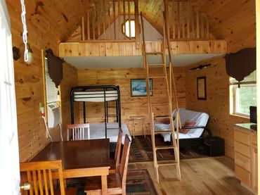 Enjoy the convenience and comfort our cabins, bunkhouse, or yurt can bring you while camping! Refer to specific cabins for included amenities.